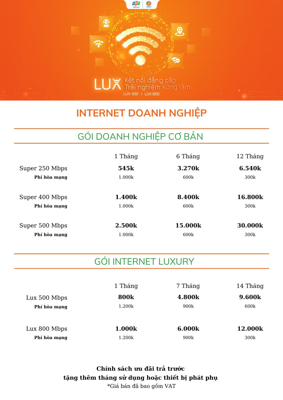 FPT Telecom với nhiều gói cước Internet nhằm đáp ứng nhu cầu người dùng “cá nhân, hộ gia đình và doanh nghiệp”. FPT Telecom luôn cam kết về chất lượng dịch vụ và chất lượng sản phẩm tốt nhất thị trường. Hiện nay, cung cấp các gói cước Internet như sau: Dưới đây là bảng giá tổng hợp: